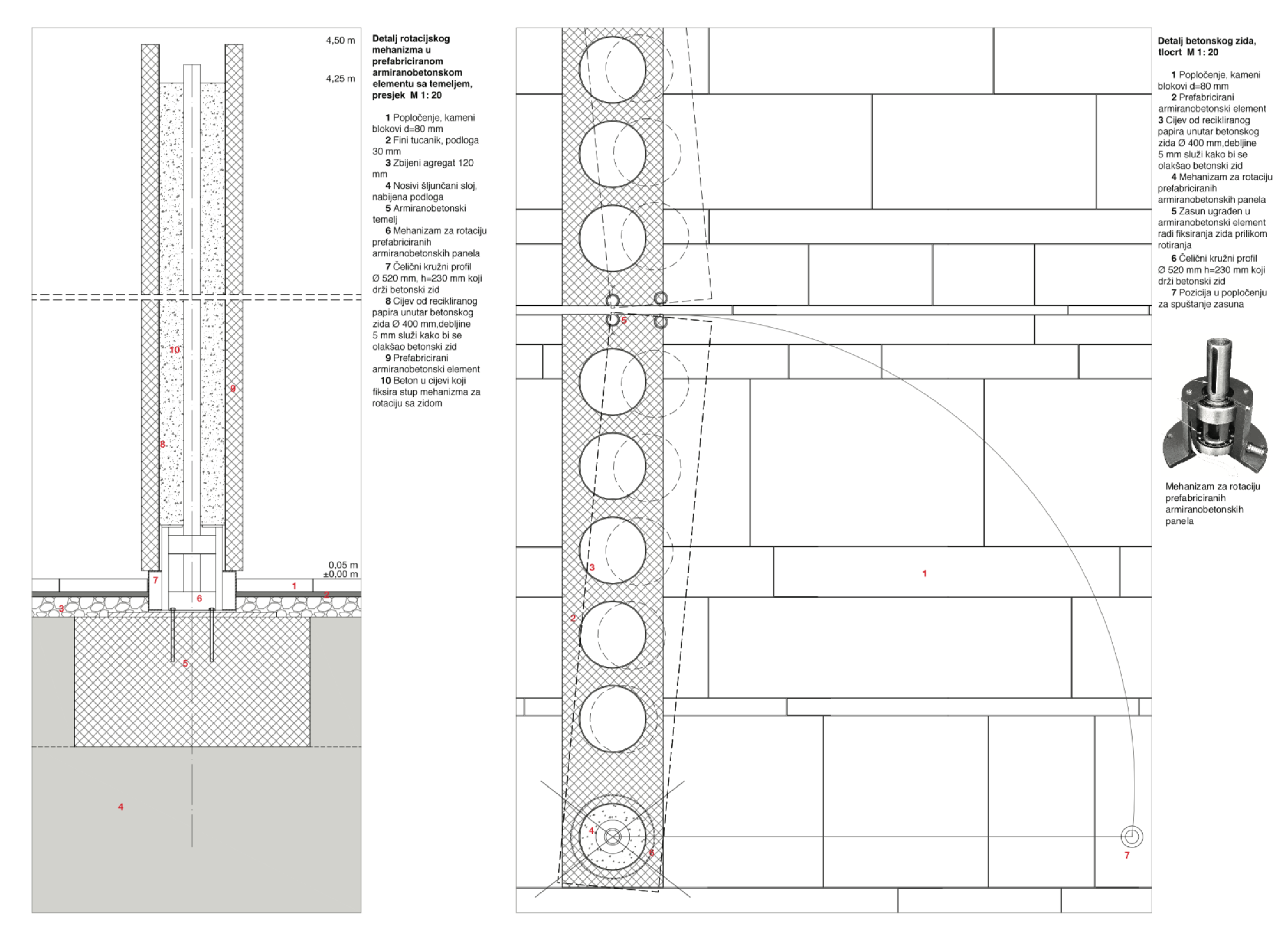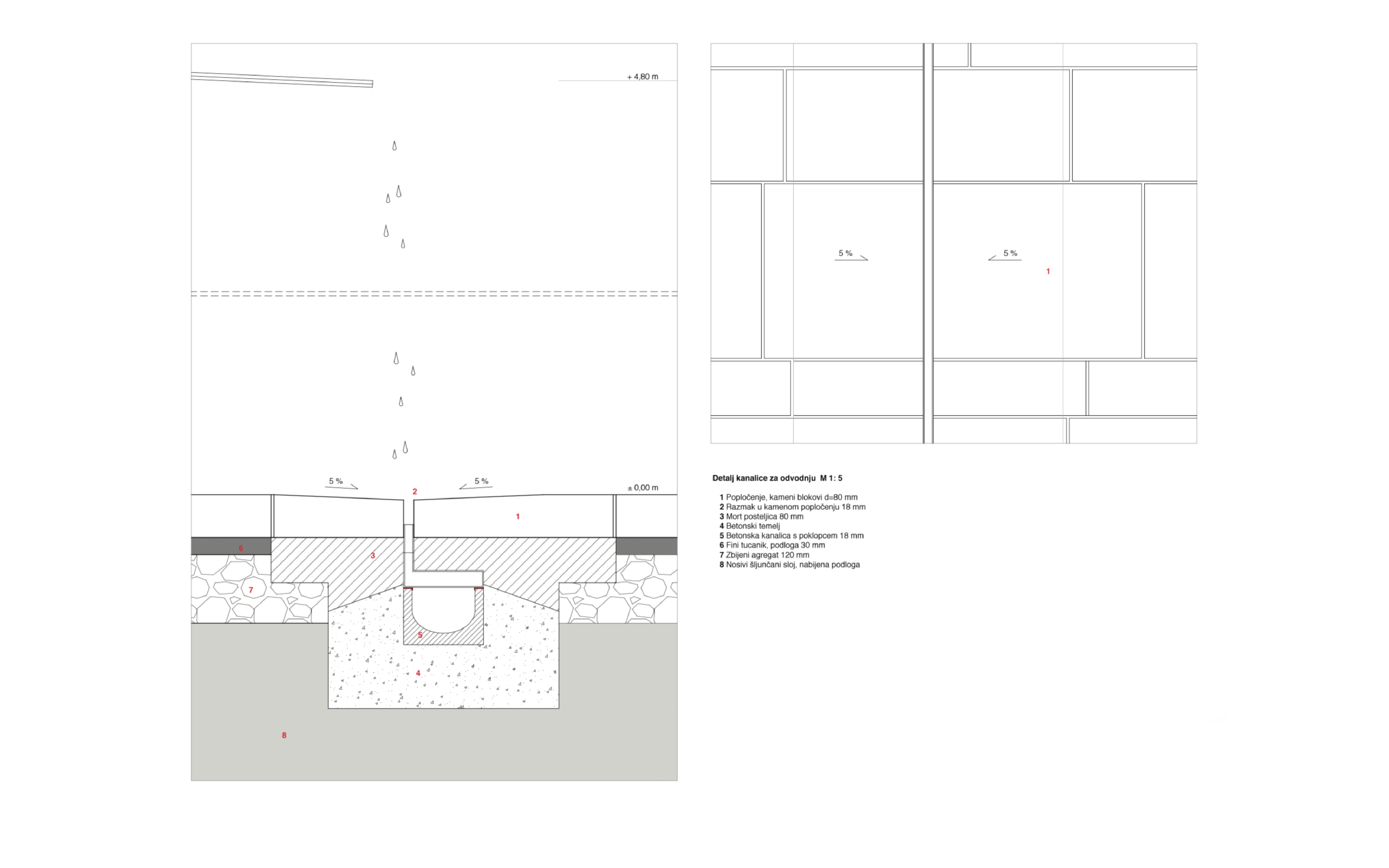 Elementi koji se koriste u prostoru su preuzeti iz samog grada i interpretirani na suvremeni način. Izvedbom zidova u betonu postigla se monolitnost koju zahtjeva kamena pozadina srednjovjekovnih kala, no njihovom prefabrikacijom, perforacijama određenih panela i dodavanjem čelika zadovoljavaju se suvremene potrebe paviljona. Rasvjeta je razapeta između 4 stupa, jarbola, nastala kao asocijacija na dalmatinske tiramole.